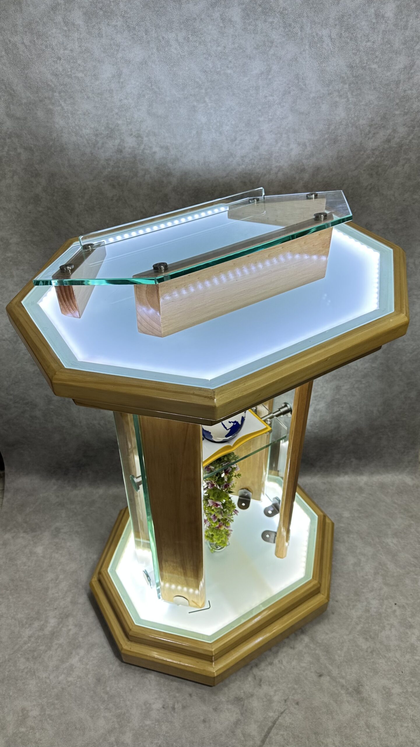 Consta de 3 sistemas de iluminación, al igual que el púlpito Plenitud y el púlpito Pacto eterno, resaltando los elementos decorativos que quieran usar, y, tal vez, la ventaja más grande es que aunque tiene todas estas virtudes de los púlpitos de alta gama, que son los más costosos que tenemos en nuestra colección, el púlpito ELYON es muy económico, sobrio, sencillo y no ocupa mucho espacio, pero produce una imagen de diseño de alto impacto, ya que dentro de él posee un motor que hace rotar dentro de él la decoración que quieran usar.