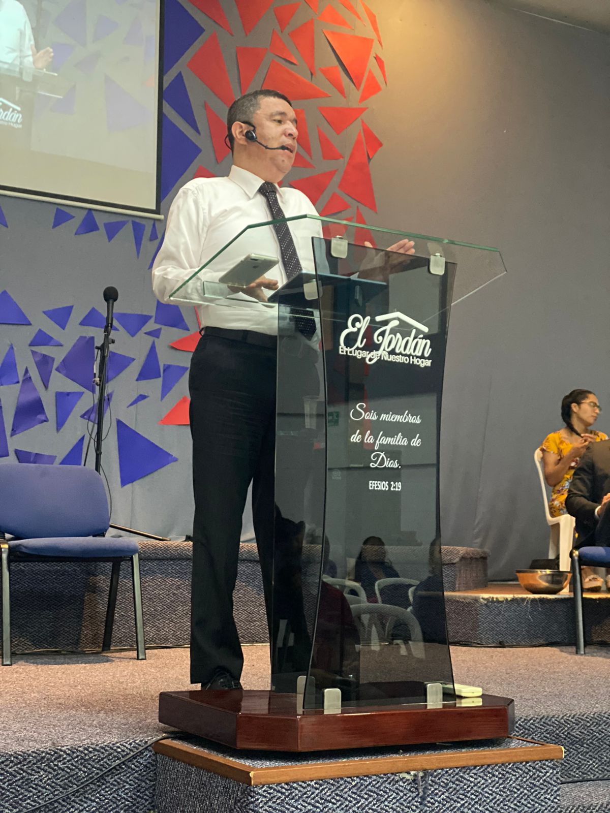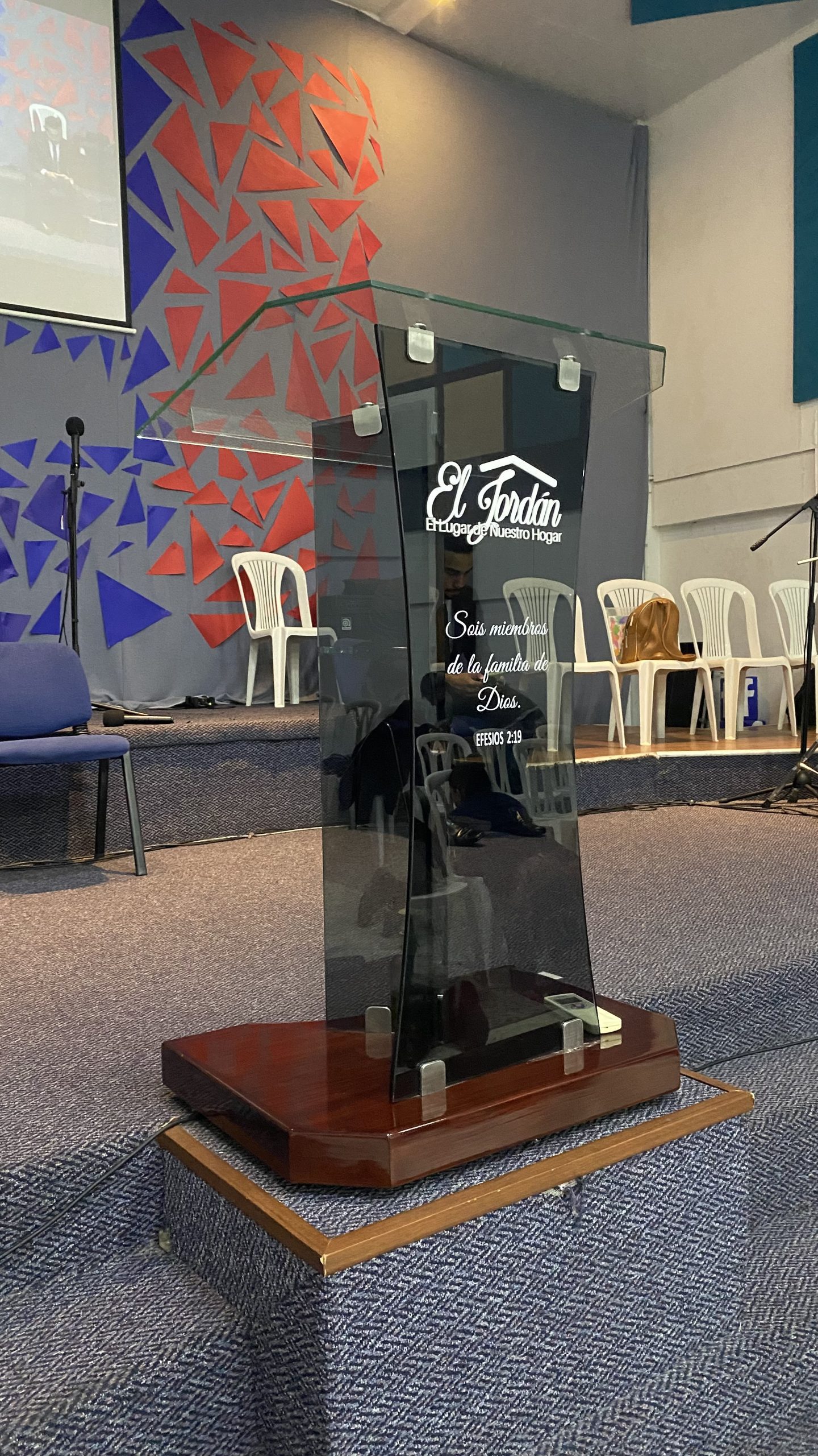 Construido sobre una base de madera de fino acabado, es el primer y único púlpito en cristal negro ahumado.